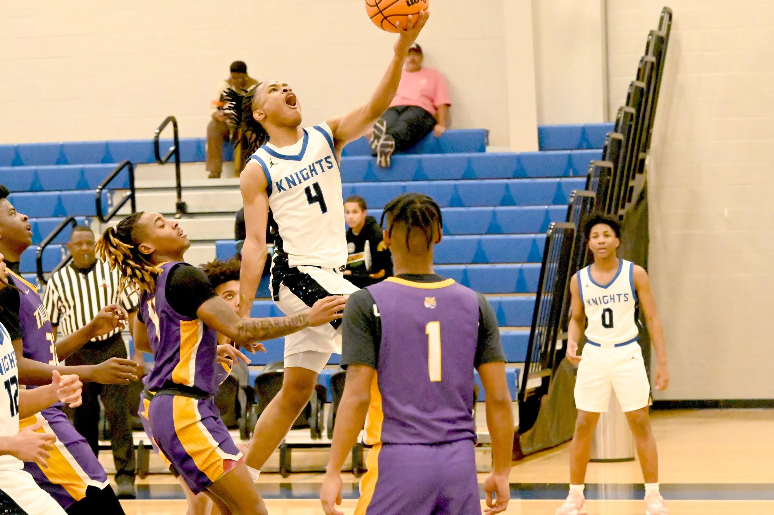 Catholic’s Matt Gourdine scores on a one-handed shot in the Knights’ win over Tallassee on Monday. (Tim Gayle)
