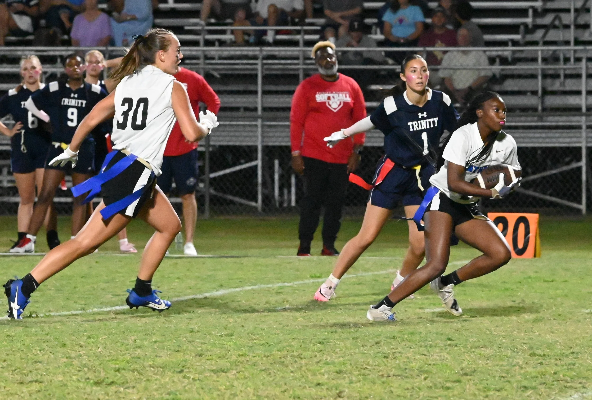 The confidence of seniors Marley Sharpless and Emma Rose Meldrum proved to be the difference in the game as Sharpless turned a pair of short plays into long runs after ACA defenders failed to pull her flag and Meldrum snatched a pass away from an ACA defender at the goal line for another score.