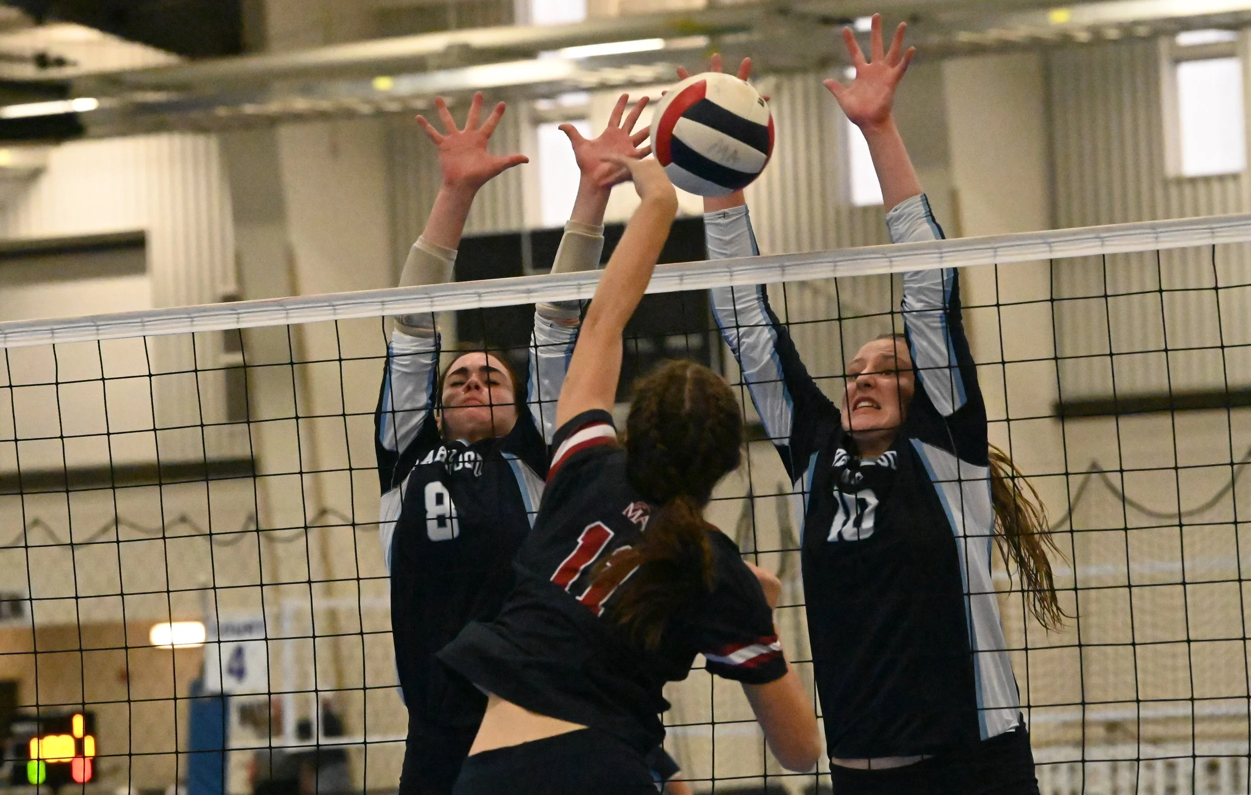 Montgomery Academy’s Addison Kitchens with a spike over two Briarwood defenders during the Mayor’s Cup tournament at the Cramton Bowl Multiplex. (Tim Gayle)