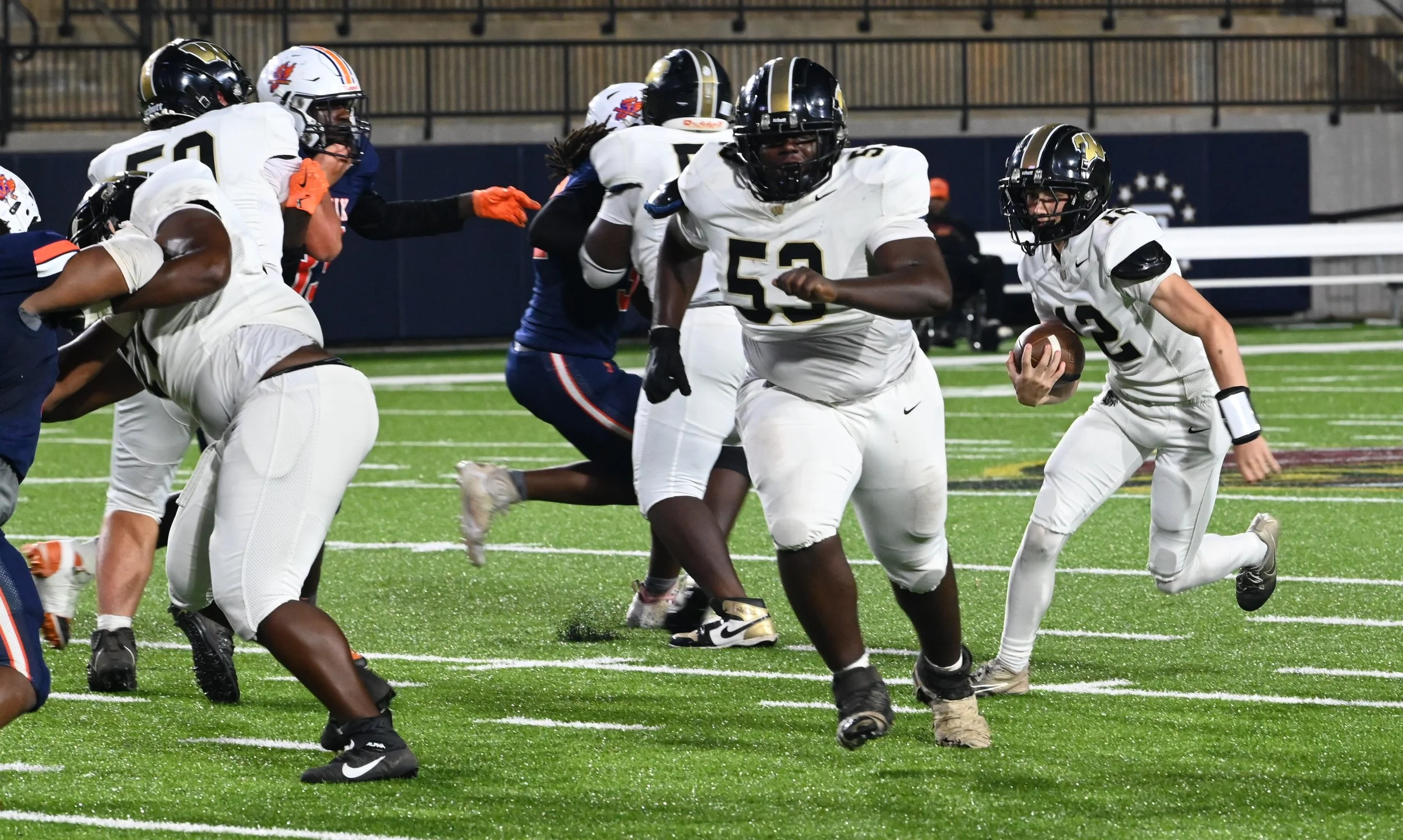Quarterback Charlie Skipper follows the block of Jeremy Collins in Wetumpka’s win over Julian on Thursday at Cramton Bowl. (Tim Gayle)